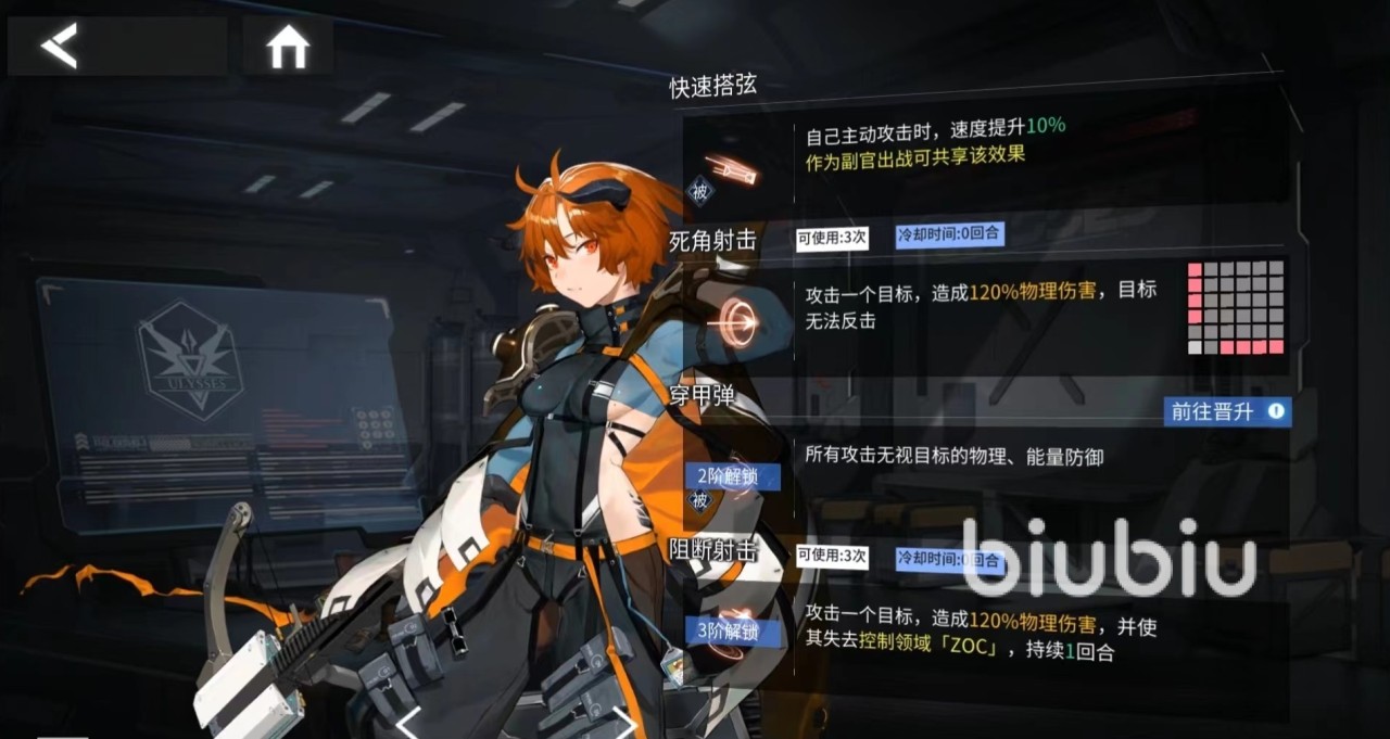 第1个被动技能快速搭弦,当自己主动攻击时速度提升10%,如果是作为副官出战,则能将该效果直接共享。速度在游戏战斗过程中起到作用非常关键,因为并非是真正回合制,所以速度更快角色自然能占据优势,目前游戏中能够提高速度的技能效果并不多,罗宾技能算是很出色一个。主动技能死角射击,能使用三次,无任何冷却时间,攻击目标造成物理伤害后目标无法反击。