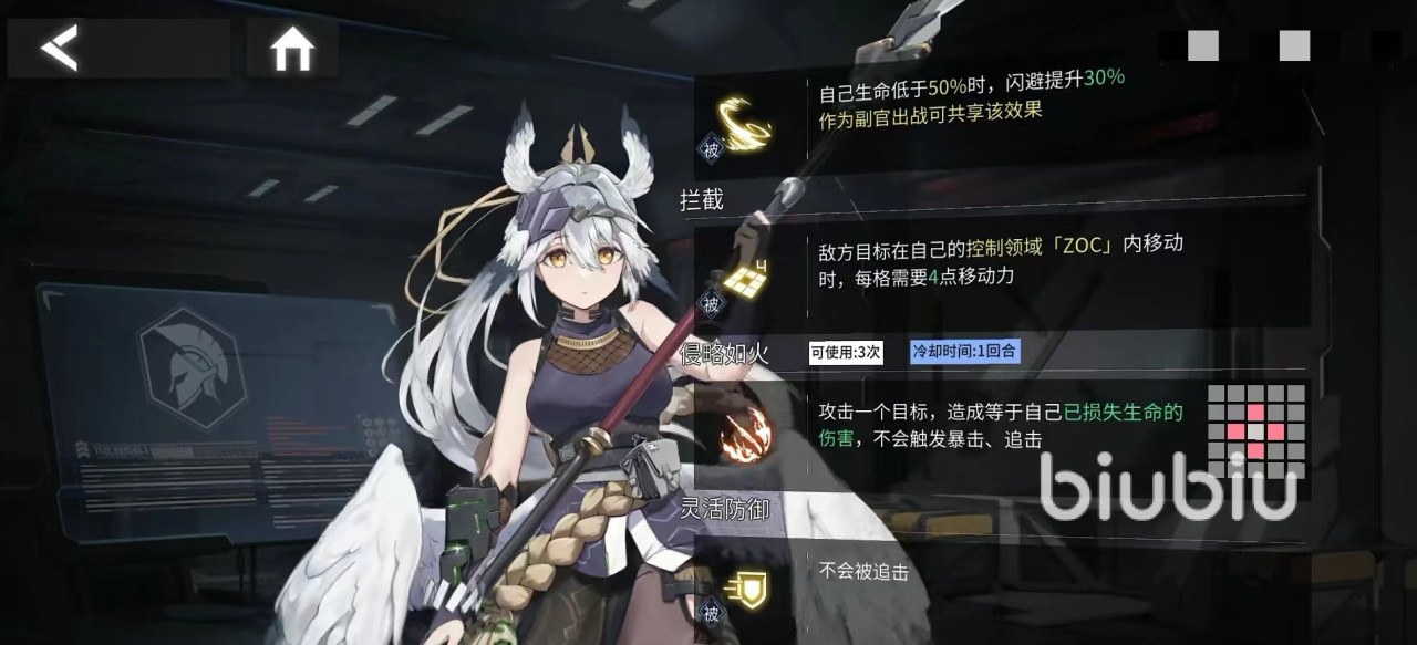 另外一个被动拦截,是护卫角色固有属性,当敌方目标在自己控制领域内移动时,每一格需要四点移动力。移动力是固定数值,移动力越高则移动自由性也就越强,现在每格需要消耗移动力大大提高,也就相当于限制了对方在自己区域内移动,对限制敌方位移也是很有帮助的,这也是护卫重要功能所在。主动技能侵略如火,能够使用三次,每次使用后冷却时间一回合,攻击一个敌方目标,按照自己已经损失生命值来计算伤害。此效果不会触发暴击和追击,自己损失多少生命值也就可以对敌方造成多少伤害。