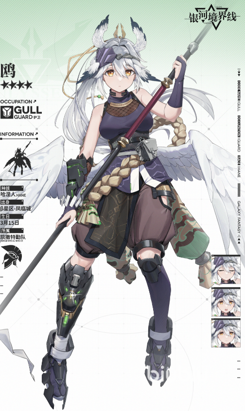最后一个角色便是鸥,同样是出生于凤鸣城的角色,本身稀有度方面只有四星。但本身而言是一个认真好学的努力家,所属部队为凯撒特勤队。游戏中表现血越少,技能伤害越高,后期的话可能作用不大,但在前期能作为开荒角色使用。
