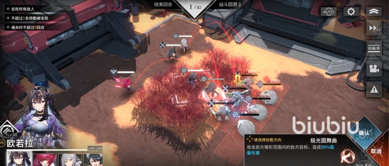 琉火作为哨兵,肯定是先出手的,不过这一关卡的挡路异构虫倒不需要她来消灭,所以小编建议把她移动至异构虫们的后方,也就是出口位置。玩家可以让欧若拉先出手,释放她的【极光圆舞曲】来对前方的所有异构虫造成90%能量伤害,接着让弧月释放出自己的【燎原炽羽】直接消灭掉这群异构虫。