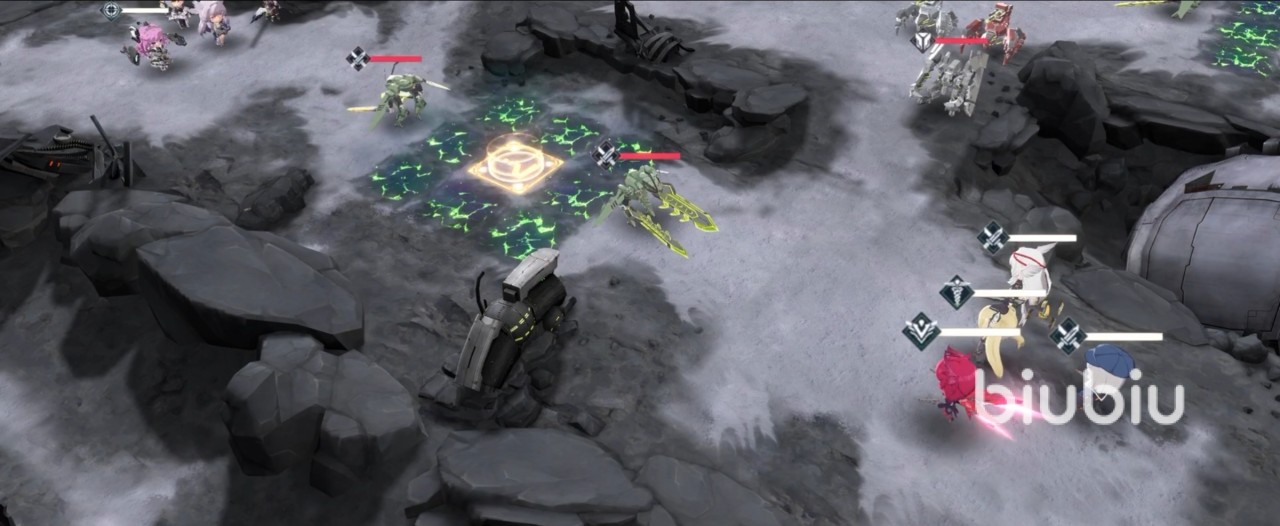 然后玩家就可以去安排左队的弧月去攻击位于左边的强袭α型异沟虫,接着血叶兰、鸥依次出手,这只站在左边的异构虫差不多就被解决掉了,玩家可以安排右队的琉火站到传送节点位置,此时再对异构虫进行攻击,即使没有一击杀掉它也无妨,因为传送节点是有陷阱的,所以在它对琉火进行反击时,就可以让它掉入陷阱被电死。