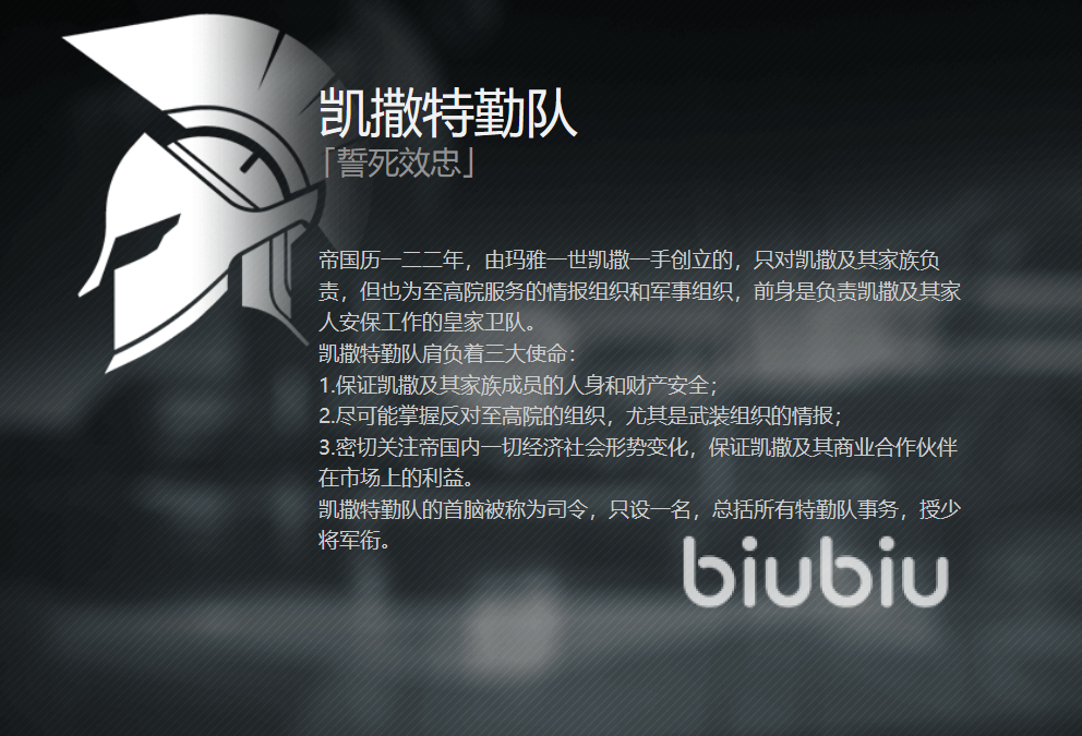 在游戏中,一共分为主要的四个大势力,四个大势力的理念都不相同,但都是为了保卫人类世界而战,他们下辖的特勤也当然性格各异,首先就是凯撒特勤队了,这个组织是一个纯军事化的组织,认为只有将所有人类军事化管理后才可以集中力量客服异构虫的威胁,这个组织的特勤服从命令,对待敌人冷库的同时对伙伴又有浓浓的温情,代表干员当然是本作的看板娘——晚钟了。