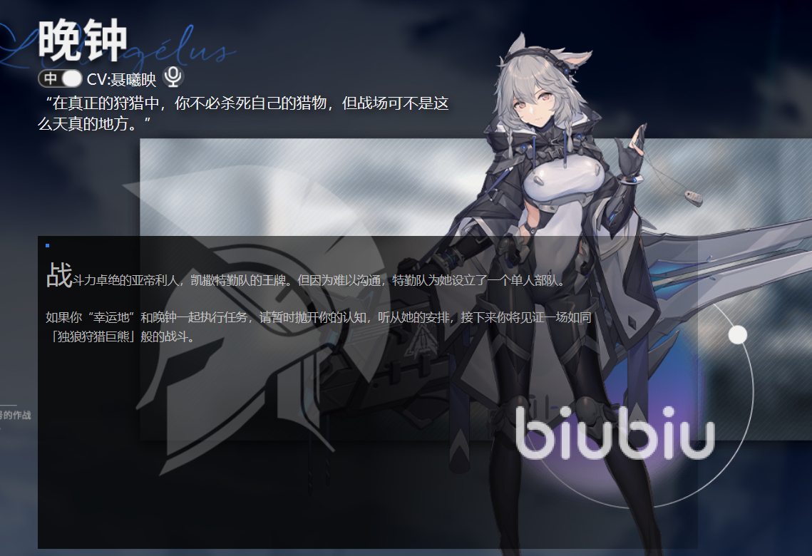 晚钟是一名岁数不大的少女角色,因为具有亚地利人的血统,故而长这可爱的兽耳,但可千万不要小瞧她,在背景故事中她是组织中任务完成率最高的特请,而在游戏中她也是当之无愧的T0级别的输出手,被动技能无视敌方防御,造成的伤害几乎和真实伤害一样,这让她在boss战中有着出色的表现。