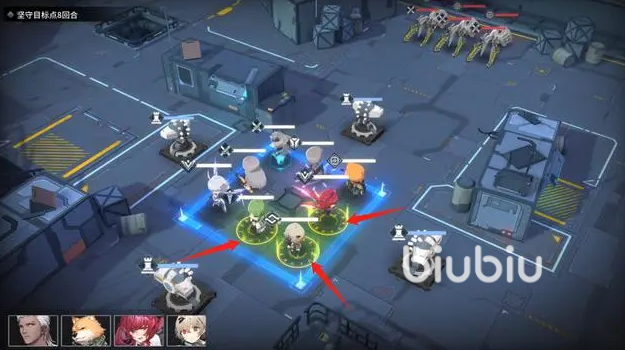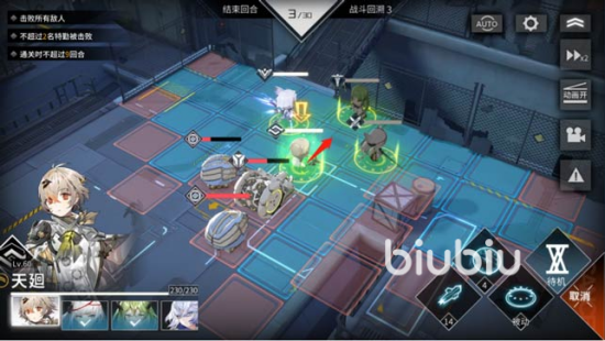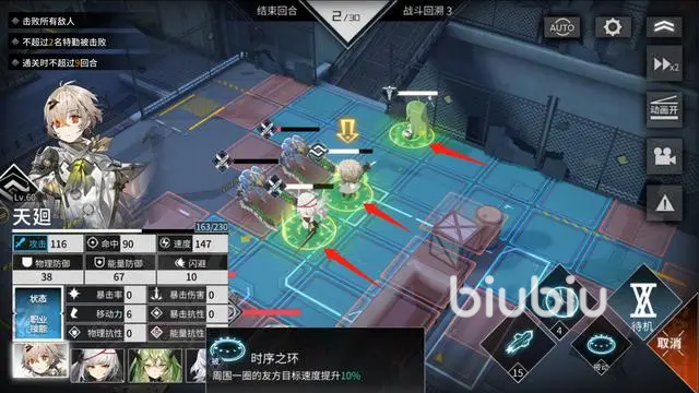 主动二技能“无尽时域·改”,技能效果为使周围四格已行动完的队友再次行动。并还能提升15%速度,持续1回合,技能次数4。范围回复技能,需要注意的是回复距离很短,比较考验玩家对战局的把控能力和排兵布阵、进攻路线的选择。技巧:尽量给天迴留下一个中心点的空间,方便天迴进来进行范围施法,使技能的回复效果最大化。