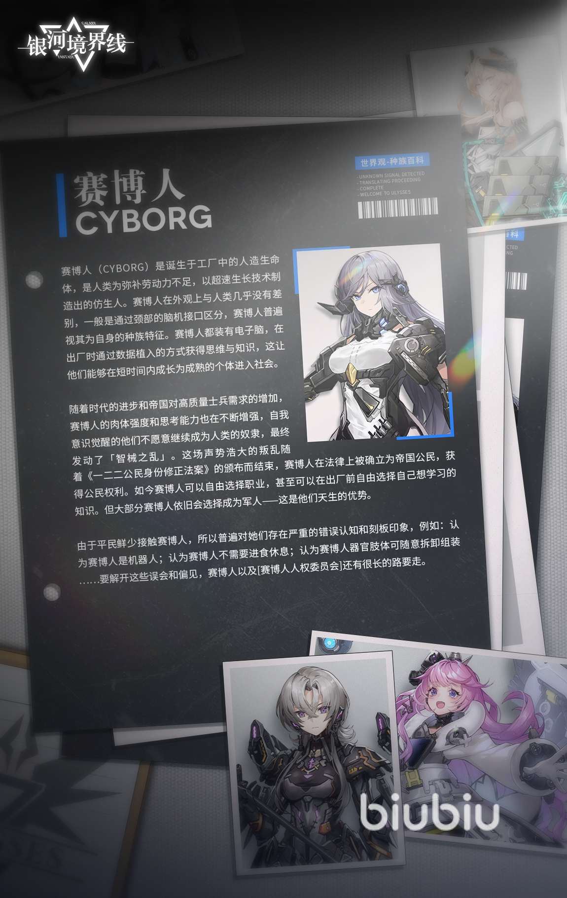 那么为什么将人族区分为亚人类和赛博人呢,因为赛博人不属于真正意义上的人类,赛博人是人类创造出来的,是人类文明和智慧的结晶,可以理解为他们是一群仿生的人类,他们的统一特点都是体魄十分的强健,同时基本不会意气用事,非常的冷静,思维十分的开阔敏捷,没有人类那么强烈的情感。