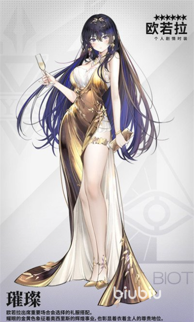 皮肤整体的基调是金色的,金色的礼服,除此之外,欧若拉的一手拿着适配的手包,另外一只手则端着一杯香槟,再配上欧若拉这张御姐的脸和及腰的长发,脚踩一双金色的高跟鞋,让欧若拉整体看起来更加的贵不可言。