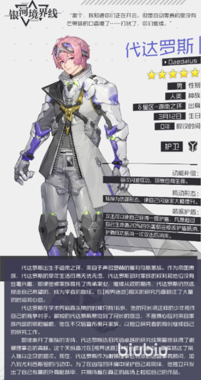 代达罗斯是一个长相出众、实力强大的男性角色,他的生命值很高,攻击力和速度都属于一般水平,物理和能量防御也相对较好。作为队伍的前排角色,代达罗斯将为后排输出角色抵挡部分伤害,给团队提供稳定的防护。他的被动技能可以在回避敌人攻击时恢复生命值,并且当敌人处在自己的领域中时,每走一格会消耗一定移动力,增加灵活性和战术选择。他的主动技能是防御技能,可以根据战斗需求灵活运用,大幅度降低受到的伤害。代达罗斯的全面实力使他成为团队中不可或缺的角色。