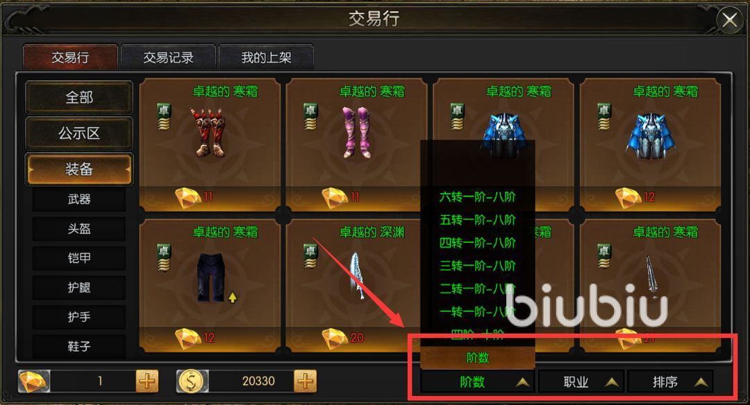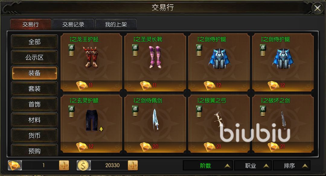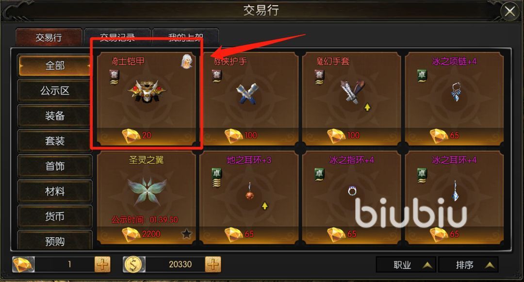 游戏内置交易行,界面右下角的“天平”图标就是。分为买入、出手、交易记录三项。购买界面中可以挑选装备、道具。游戏中购买需要用到金币以及钻石。按照类别分为装备、翅膀、首饰、材料、以及货币。大家按需挑选自己所需的装备就好。