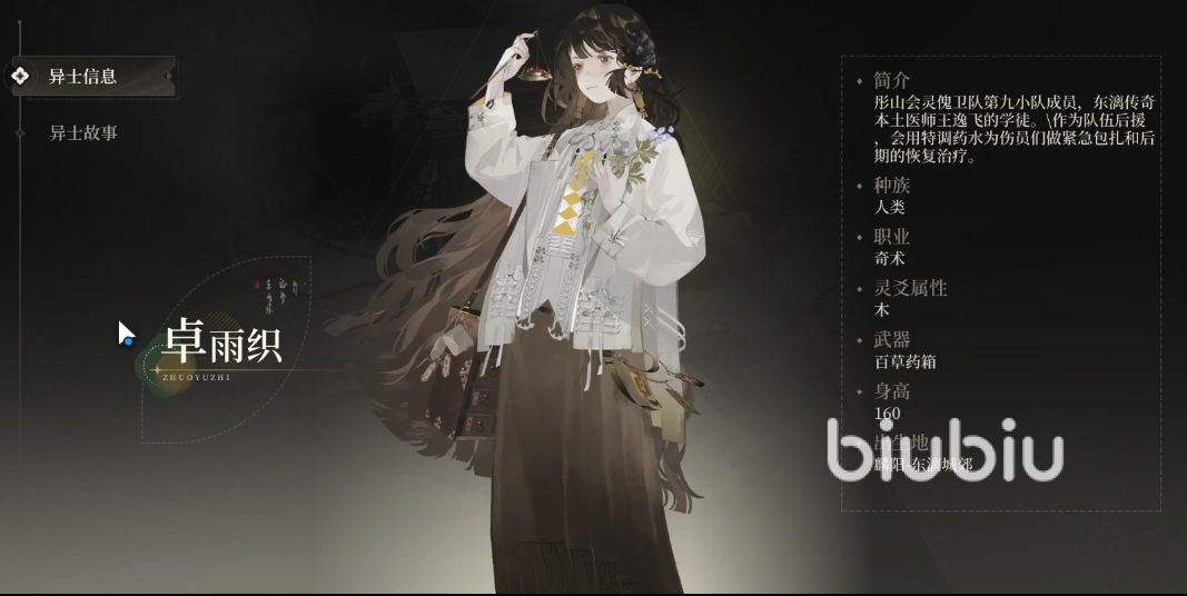 先来了解一下她的身份,她是东漓传奇本土医师王逸飞的学徒,她是以人类的身份作为灵傀卫队第九小队成员存在,她使用的是无属性灵爻属性,可以自阿战斗中较为灵活的应对各种敌人,能通过随身携带的百草药箱对队友进行治疗以及护理,可以使用珍贵的草药,还可以利用提前配置的止血回复药水来帮助队友。