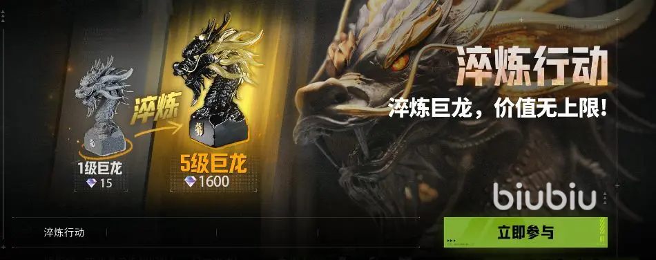 全新解锁两大玩法,首先是镭钻玩法-巨龙淬炼行动上限,这是每周末限定时间开启的,周五到周日的18点到22点可参与,每个玩家都有机会获得大金龙,1*1的原始巨龙就是大家的入场券,可深入战局寻找淬炼装置,进而开出价值无限的至尊巨龙;加入试炼,等于展开全新的冒险。