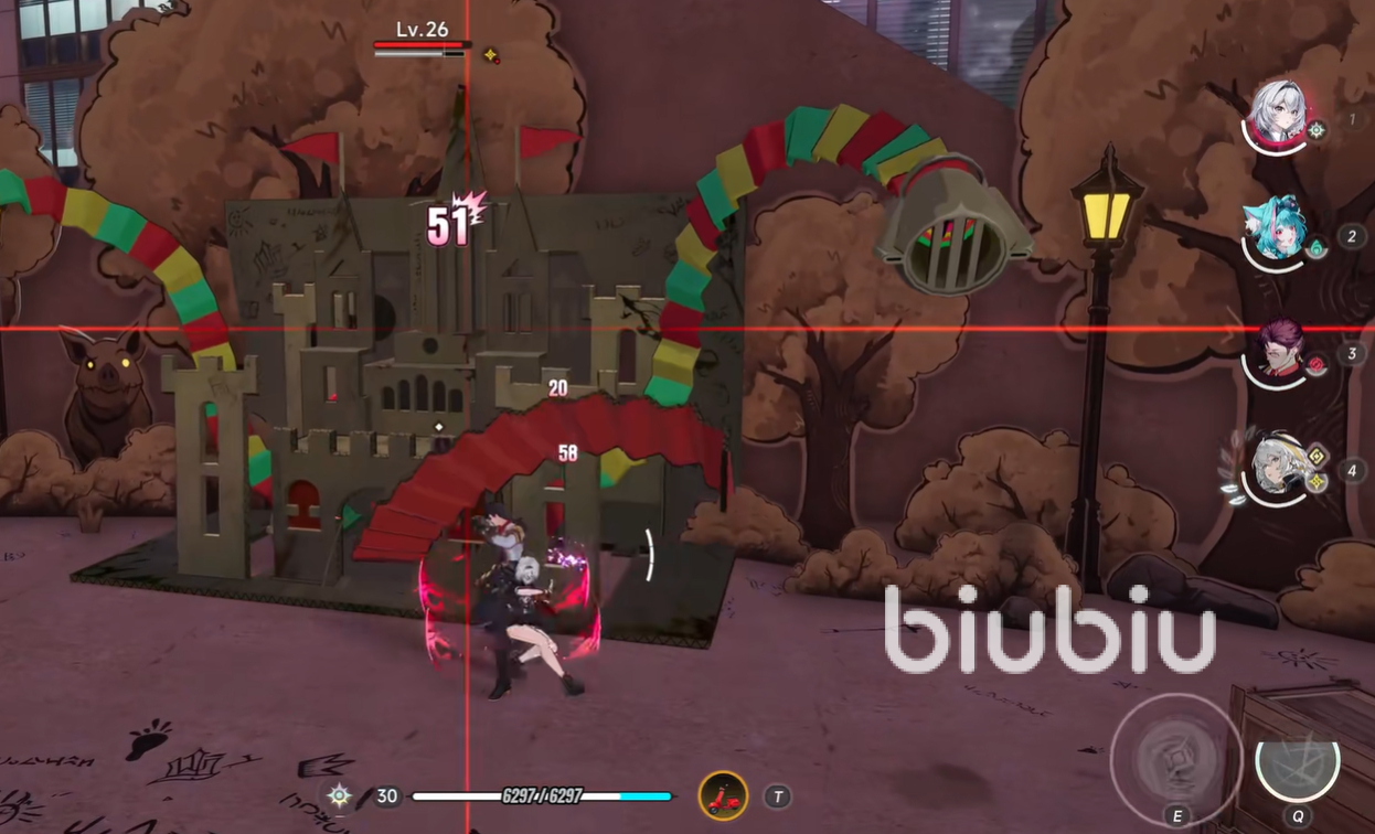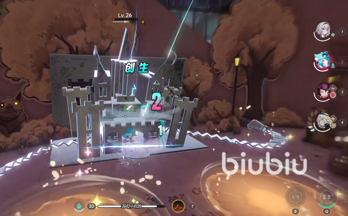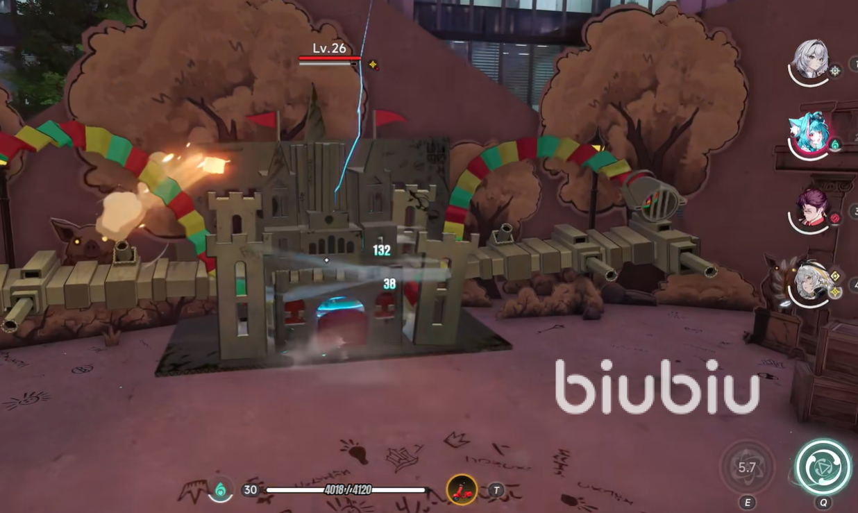 正式开启战斗后,大家就要优先攻击BOSS中间,才能有效躲避周遭的伤害!当BOSS眼冒红光时就要及时闪避了,成功后可躲掉伤害并发起致命一击!接着它还会从空中召唤出火炮,大家用大招或者援助技能躲开就好!BOSS血条下面就是韧性条,为了加快削弱它的血量就得多带破韧角色攻击!