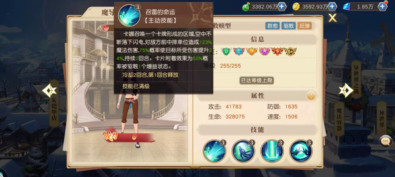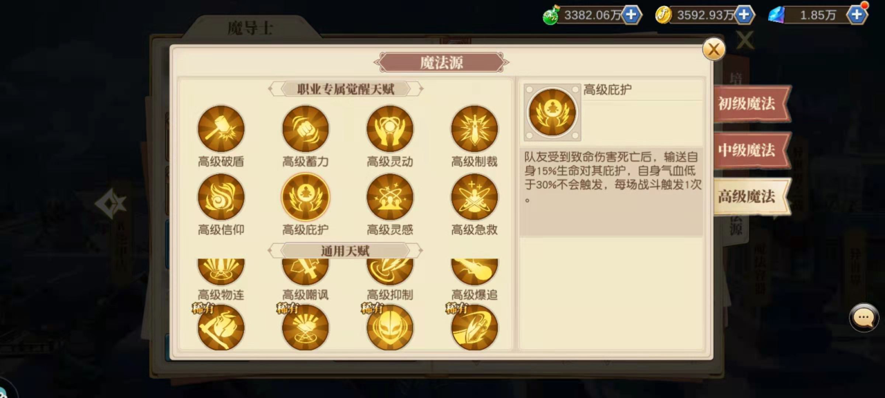 在魔法源的选择上,小编推荐高级庇护、高级灵感和高级驱散这三个技能,其中高级驱散是在攻击时,有30%的概率驱散伤害单位身上的增益效果,和卡娜的一技能招雷的命运效果可以叠加,增加了驱散的概率。高级庇护效果是在队友受到致命伤害后,卡娜输送自身15的血量给队友,从而救队友一名,是一个非常不错的保命技能。高级灵感则是在使用增益技能的时候,有30%的概率是持续回合增加一回合,这对于卡娜的三技能魔法卡片的伤害反弹增益效果是个很好的强化。