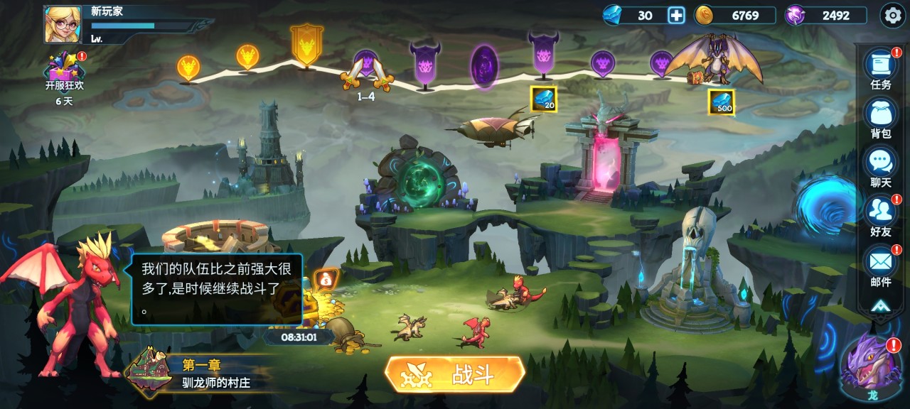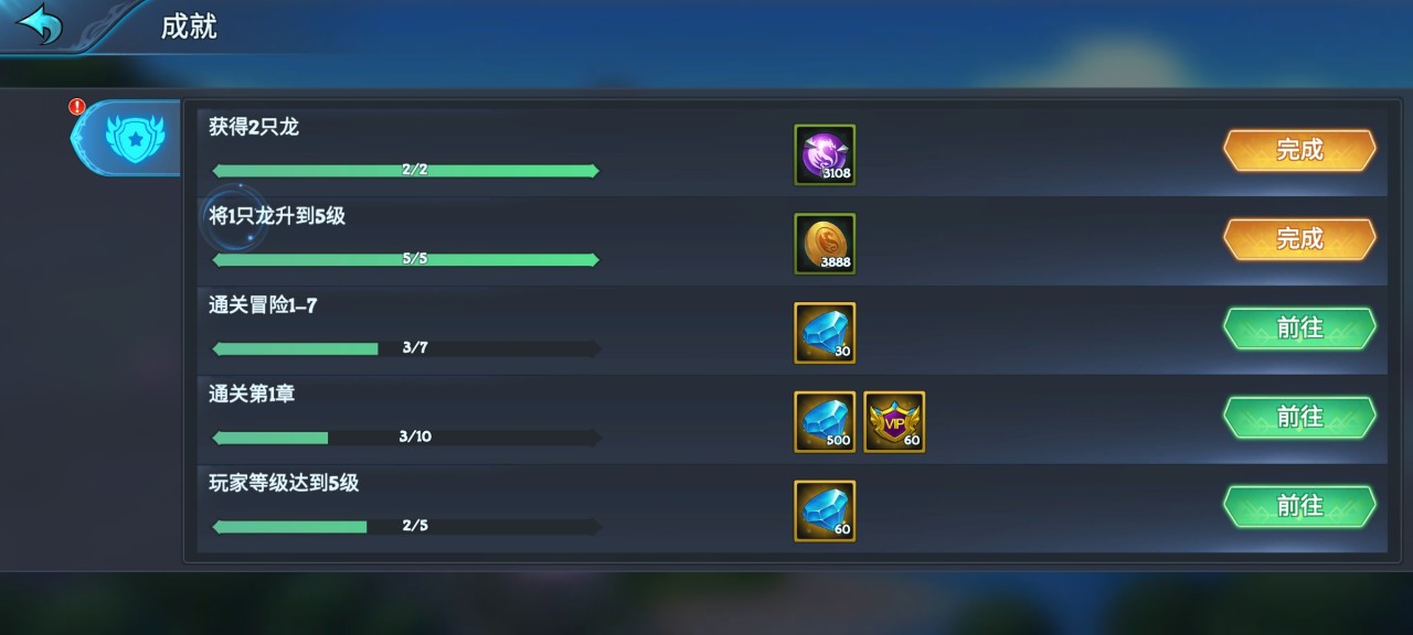 其次就是任务系统,玩家们进入游戏经过新手引导之后基本熟悉了作战模式,那么为了让游戏尽快进行,玩家们可以点击右上方的任务,然后进入成就任务界面,这里有很多我们未完成的任务,例如:获得几只龙、完成第几章节、完成哪个章节的冒险活动......玩家完成之后就可以获得对应的钻石、VIP等奖励。