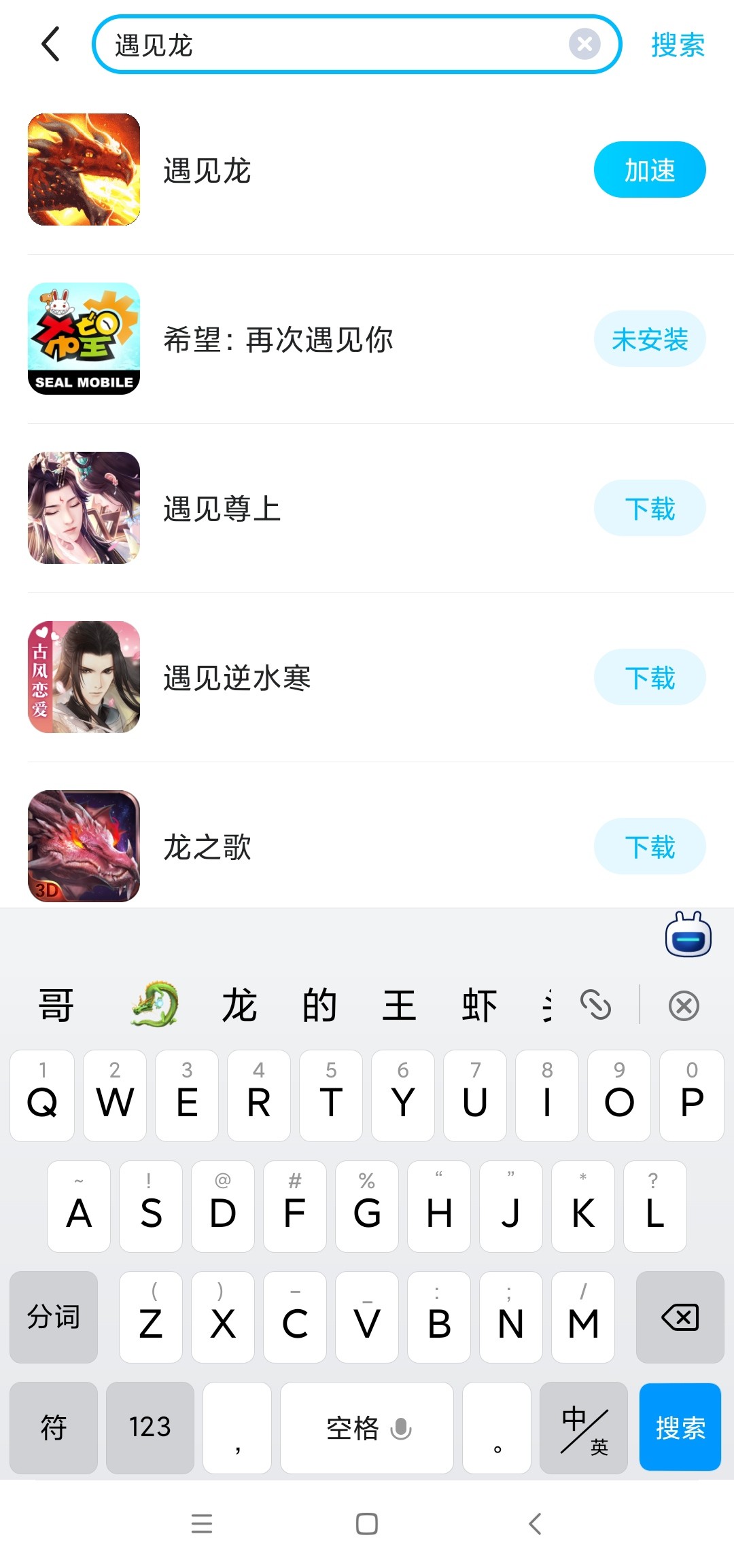 想要玩这款游戏国际服的玩家可以在自己的手机自带的下载商城下载BIUBIU加速器,等待下载完毕完成安装,在收集桌面找到蓝色的BIUBIU加速器APP,点击进入之后我们在首页顶部的搜索栏目搜索:遇见龙,弹出来最上方的就是我们这款游戏,然后点击右侧的下载。