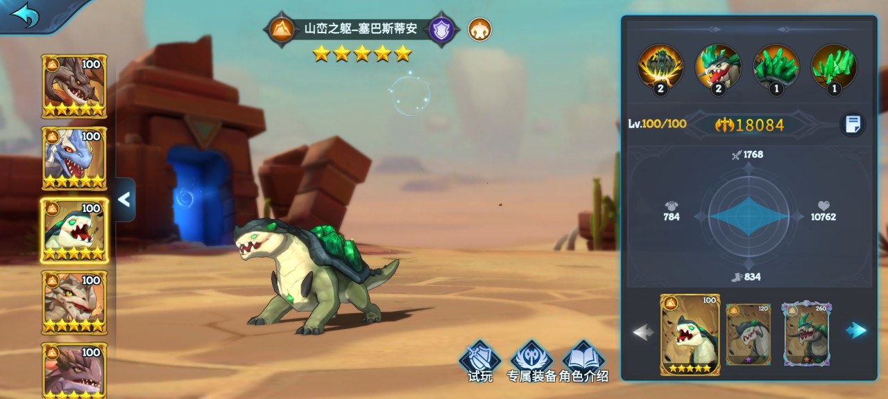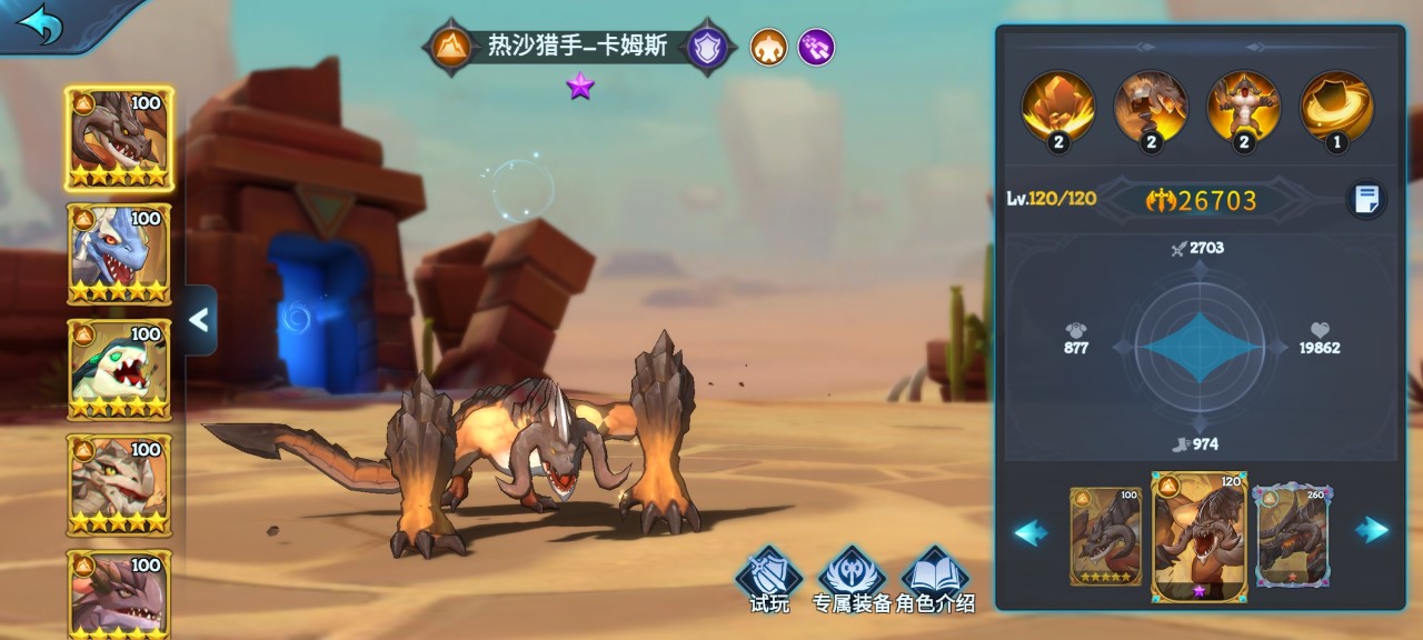 热沙猎手卡姆斯:生性勇猛的盾龙,身体强壮。一技能:崩山裂石:可以对敌人造成高额伤害并且附带石化;二技能:霸绝一击:提高伤害率,并且附带石化和恢复一定百分比的最大生命值;三技能:横行霸道:血量增加,且免疫敌人的石化效果;四技能:自身每次降低血量就会提高护甲。