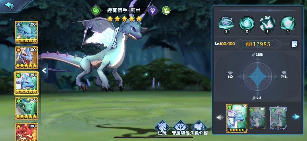 莉丝拥有风属性元素,可以克制地元素的龙。他属于玩家前期的新手角色,是系统送给玩家的福利,只要玩家认真完成新手指引任务就能获取,它的定位为输出型,精通法术,可以站在后排释放技能。莉丝常年生活在迷雾森林,因此他的技能也是带有一定的控制效果。当他挥动翅膀的时候会散发有毒气味,吸入将造成嗜睡或者神经麻痹,短时间之内无法行动,而且他的每一次技能释放都将带来一定的法术伤害,搭配自己的控制技能可以起到很好的效果。