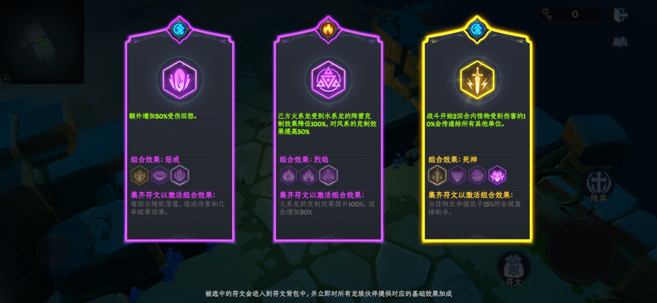 不过,比较好的是,打败守护龙后会随机掉落符文,符文分为蓝色、紫色和金色,分为攻击、辅助两大类,其中不同的紫色和金色符文可以有不同的组合效果,激活组合效果后阵容加成更多。