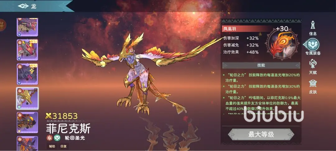 通过技能效果可以看出,3技能保证了它的攻击力和生存能力,而12技能带来的奶量还是相当可观的,能保证队伍整体的生存能力。可配备专属装备凤凰羽,能提高治疗效果,并增加全体队友防御力。