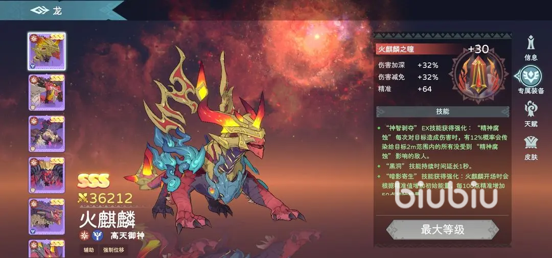 火麒麟是个控制范围比较强的角色,比较适宜放置在队伍的后排,能有效的保护己方后排输出;比较适合的队友有琉璃+圣翼+哈迪斯+烛龙;在专属装备解锁之后,能进一步提高它2技能的命中率,提升精神腐蚀的伤害,还能增加触发概率以及传染概率,穿戴高精准值的装备,能增加初始的能量。