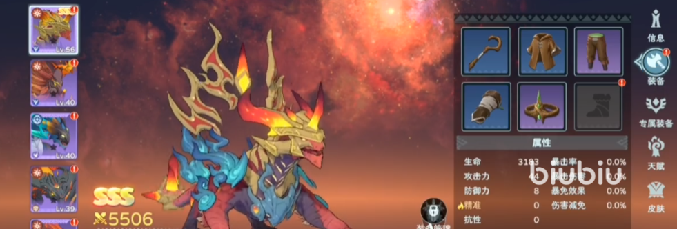 它的思维属性,攻击3845,暴击伤害150%,防御1433,血量155800,它的定位是能进行远距离范围伤害的睿智龙,防御能力比较优秀,能较大限度的保证自己的生存。1技能”黑洞”,在目标的位置制造1个持续3秒的人造黑洞,时间内,会对处于黑洞内的所有敌人造成每秒130%攻击力的伤害,并将敌人吸附向黑洞中心点。