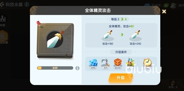 在城堡科技水晶里,玩家可以提升精灵的各个属性,随着城堡等级的提高,科技水晶会开放更多属性强化。