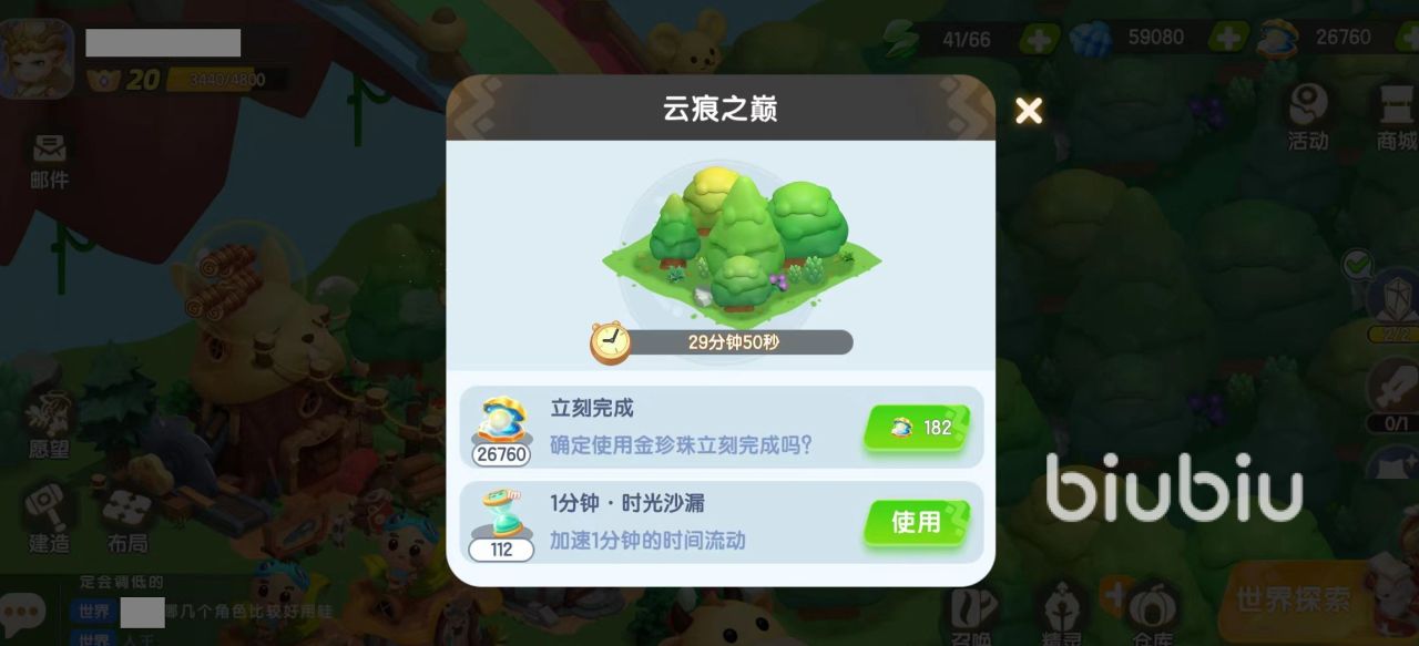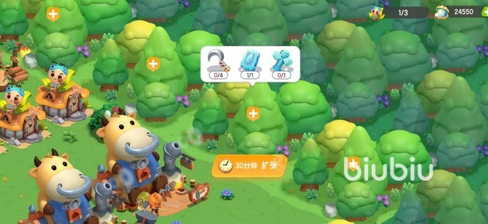 我们在地图上看到有小加号的树木,就是可以被清除掉的树林。清理树林需要材料,普通的材料玩家可以自己制作,另外轻羽柱子和轻羽云砖这两种比较难获得,是通过许愿之井完成角色心愿获得的。随着领土的面积越来越大,清除树林需要材料也越多,材料实在不够的话,玩家也用金钻石去补足。