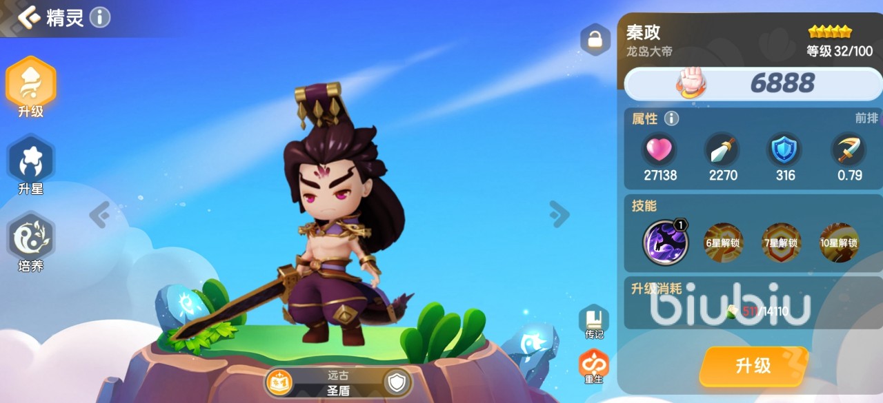 这个角色是一个前排精灵,属于远古,职业是圣盾。秦政虽然是个前排精灵,他更倾向于输出和减抗,可以对全体敌人造成高额的伤害的同时,还能降低敌人的防御力。升到10星后,还能提升己方的防御力。