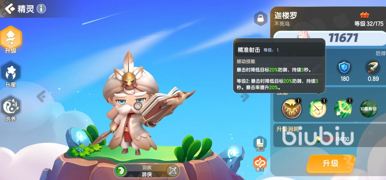 这个角色是一个后排精灵,属于羽族,职业是游侠。后排精灵在游戏中通常是承担着输出的责任,迦楼罗在对敌人造成伤害的同时可以降低敌人的怒气,升到10星后,每次攻击可以增加额外的攻速,最多可以叠加10层。
