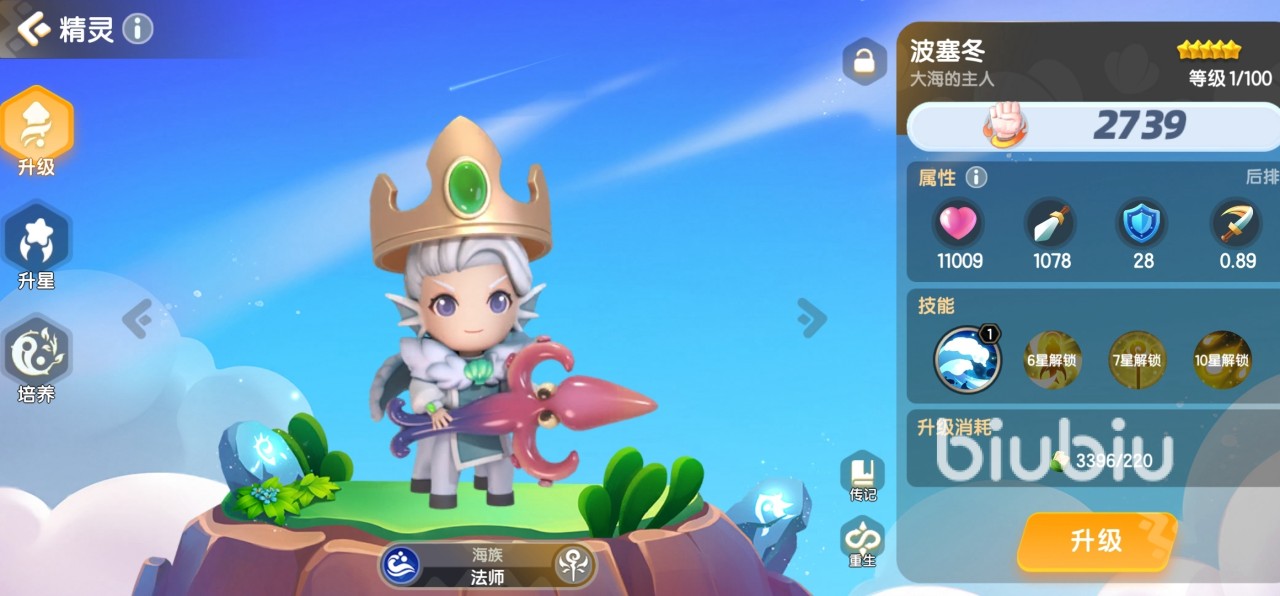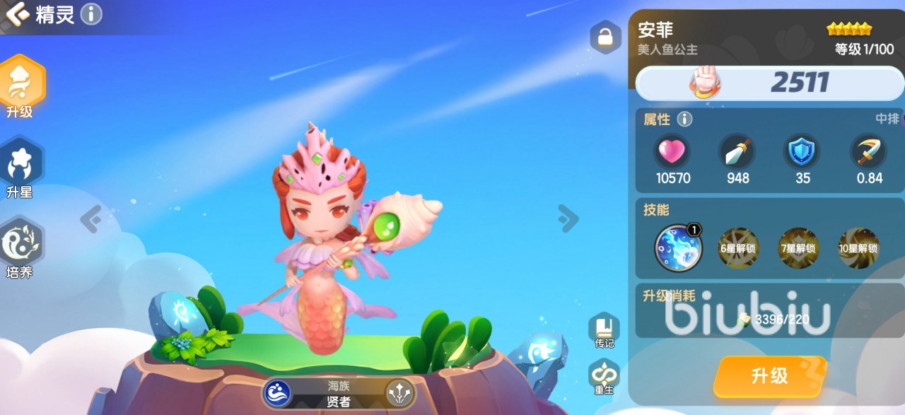 这个角色是一个中排精灵,属于海族,职业是贤者。中卫精灵的作用大多都是治疗的辅助精灵,安菲可以对队伍中生命值最低的队友给予生命恢复和护盾,保护能力非常得强。升到10星后,还能提升己方的最终伤害。