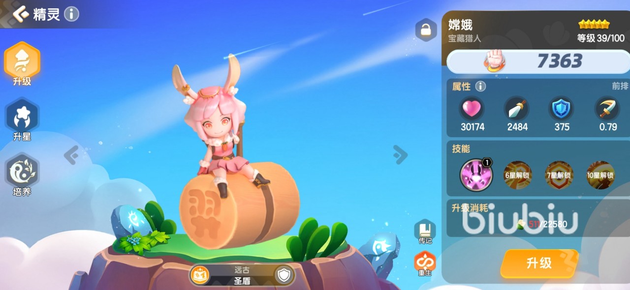这个角色是一个前排精灵,属于远古,职业是圣盾。嫦娥是少有的前排角色里带有治疗效果的精灵,她可以对己方全体施加治疗效果,恢复该精灵自身攻击力200%的生命值。如果精灵的攻击力也高,恢复量也越高。阵容里有嫦娥,甚至可以不用带其他的中排精灵,可以多带后排和前排精灵来提高队伍的战力。
