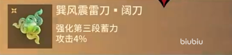 阔刀类的魂玉分为金、紫两种,首先要带大家看的是阔刀的金魂玉,它的金魂玉叫做巽风震雷刀·阔刀,该魂玉装备之后可以提升4%的攻击力,之后可以改变阔刀三段蓄力的效果,可以让原先的三段蓄力斩击变成旋转攻击。