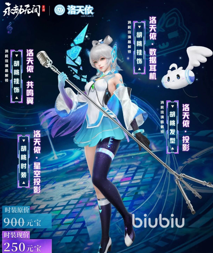 本次联动将会推出胡桃外观的“洛天依星空投影”,原价是900元宝,先上新价只需要花费250元宝,购买捆绑包还能拿到胡桃极品时装、斩马刀极品皮肤,只要300元宝就能同时拿下2件外观更加优惠。