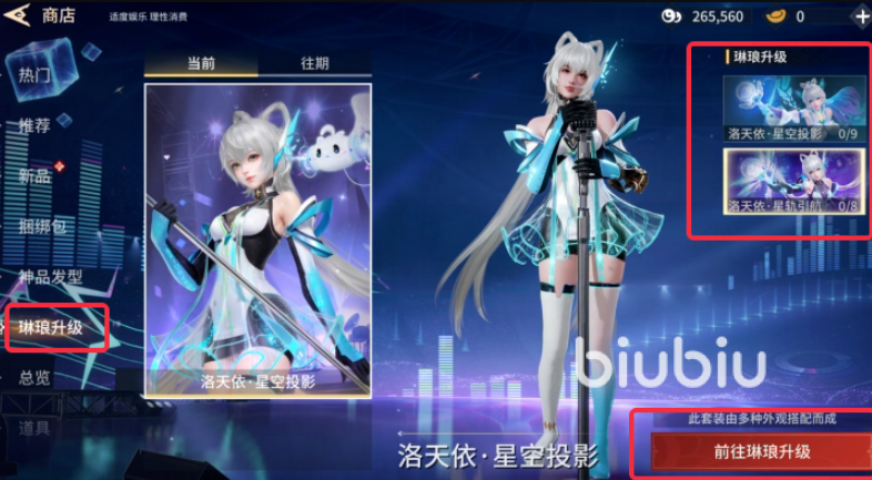 解锁时装后,还可以开启“琳琅升级”,并额外随机获取一个需要消耗琉璃晶能拿到的外观,并且消耗琉璃晶还能在商店系统的“琳琅升级”中,解锁洛天依其他配套外观,包括发型、挂饰、技能特效等等,发型“投影”可以将灰发扎成∞形环状马尾,形似蝴蝶搭配上发饰和投影出的发尾,既有未来感又充满东方韵味。
