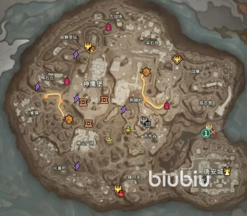 新玩法了解后,接下来要带大家看的是游戏中的资源区分布,这资源区需要了解的是高级特殊资源区,在这张地图中这资源区叫做唐安城,这资源区中拥有新的金堆、新的神奇大宝箱和新的怪物,此外还有一个掉血的机制,进入其中后会受到环境影响持续掉血,不过在城中是有针对掉血的方法的,那就是城市中的御毒柱,只需要在御毒竹的范围内待够三秒的时间,那接下来就可以免疫毒气很长时间,但是并不是永久的,下面会显示时长,大家需要在时间快到的时候找到下一个柱子进去吃buff,这么一来就能消除毒气的影响了。
