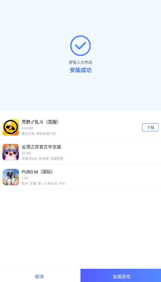 安装成功后,直接点击页面下方的“加速游戏”,就可以立即打开游戏并加速了。如果玩家想稍后再进行游玩,可以先点击“取消”,稍后在biubiu加速器的主界面找到野蛮人大作战再进行加速。