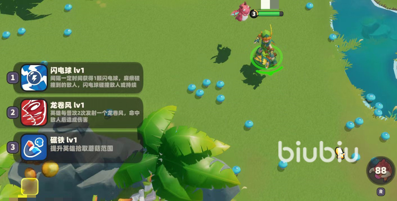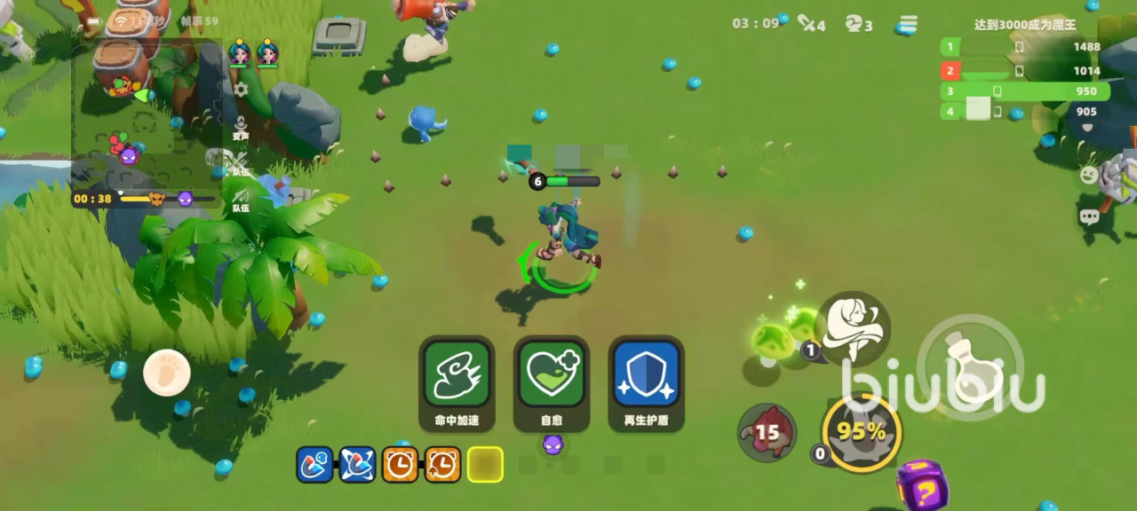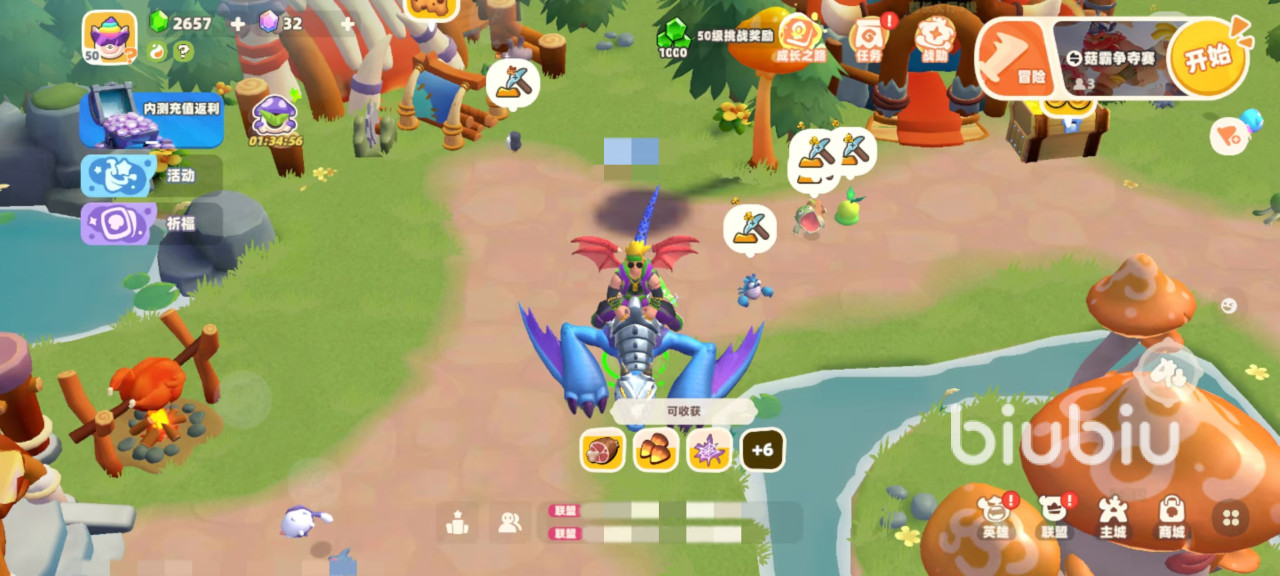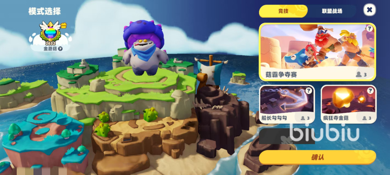 第1个模式是菇霸争夺赛,这是典型的3v3v3即时战斗模式,也是游戏中最受大家欢迎的类型,节奏非常快,一局只需要大约5分钟就能搞定。玩家通过吸取蓝色蘑菇,击败野怪和菇霸来获取等级升级所需的经验。每次升级可以随机获得技能,通过队友之间的配合和不同天赋组合,让自己或队友成为大魔王,以积分来取得胜利。