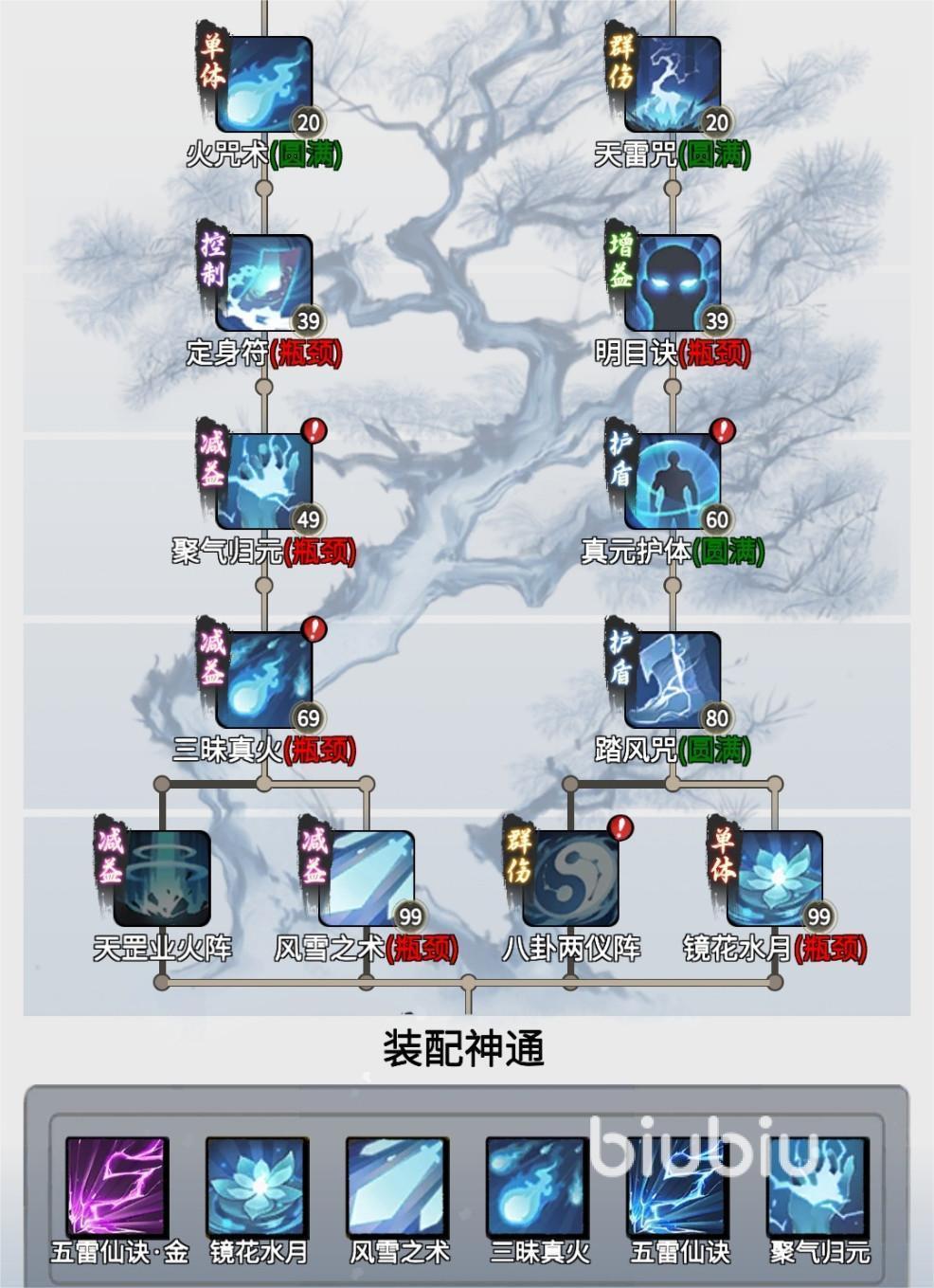 前期(游戏初始阶段):可选取天雷与明目这两种神通。天雷能够给予相当可观的伤害输出,大幅提升打怪的效率;明目能够增进洞察力,有益于更精确地判别敌人的行动趋向。