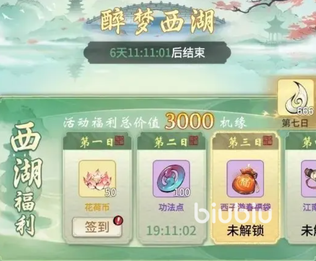 当然这些都是付费的活动,很多玩家期待的一定是非付费的福利内容,这次准备的就是西湖的签到内容,福利的总价值三千的机缘,所以玩家到时候一定要及时的上线签到领取。