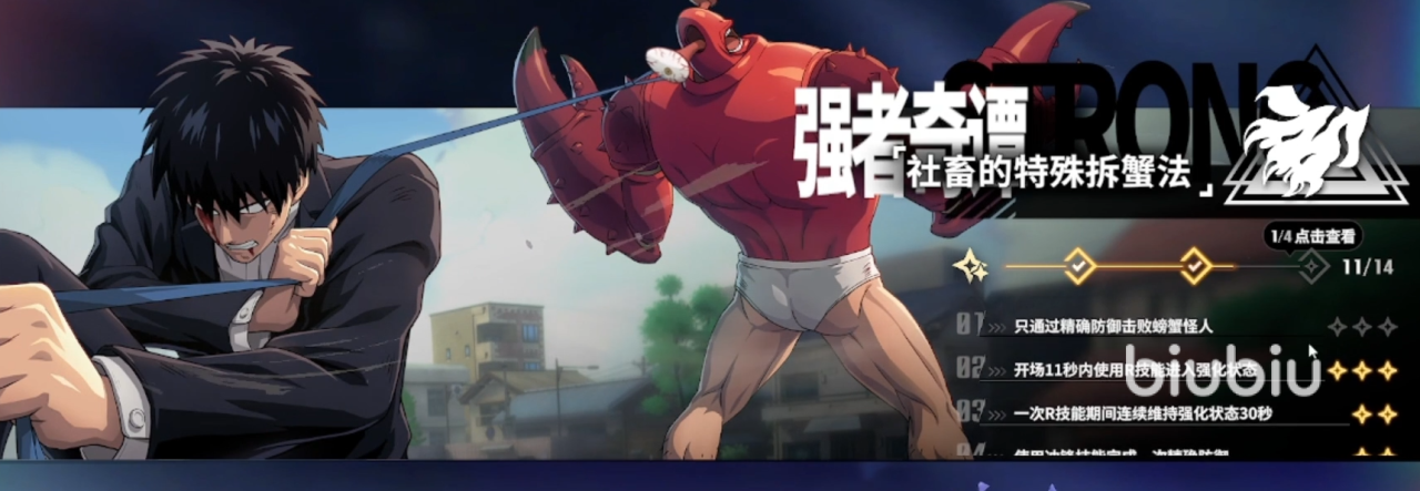 就目前来看,大家如果是第一挑战螃蟹怪人的话,一定能完成的任务有开场11秒内使用r技能进入强化状态、开启强化状态之后维持强化状态30秒、使用防御技能进行一次精准的防御、使用闪避技能完成一次闪避。使用主动技能打出一次暴击。