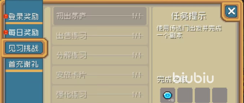 见习挑战就类似于新手任务了,多数任务都是比较简单的,而且不怎么吃玩家装备的练度,玩家只需要根据指示便可以获得不同数量的蓝币,就是该任务一次性的,做过了就无法进行重置。