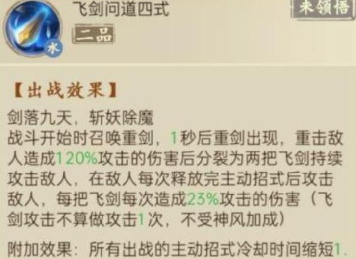 飞剑问道的效果是开局释放,对敌人造成伤害,并且,在随后的时间里,敌人每次释放技能,都会对敌人造成伤害。这在对局中,可以为玩家补充大量的伤害,是玩家不可多得的技能选择。