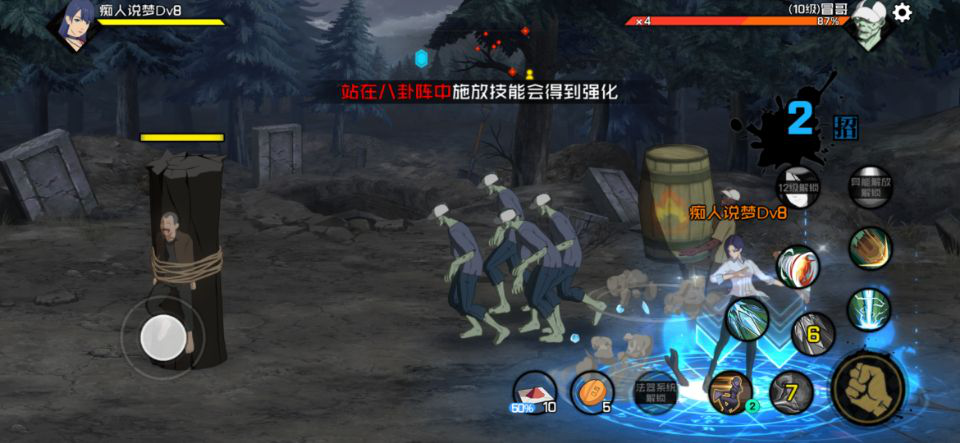 八卦的普通攻击会在脚下产生一定范围的阵法图案,站在蓝色八卦图内释放的技能会得到强化,所以这算是我们技能组合中必备的一个,在合适的位置先手普攻释放法阵,而且作为远程的八卦普攻不需要贴脸,不过最好是聚怪之后确定输出环境后释放,接下来就可以在法阵中输出了。