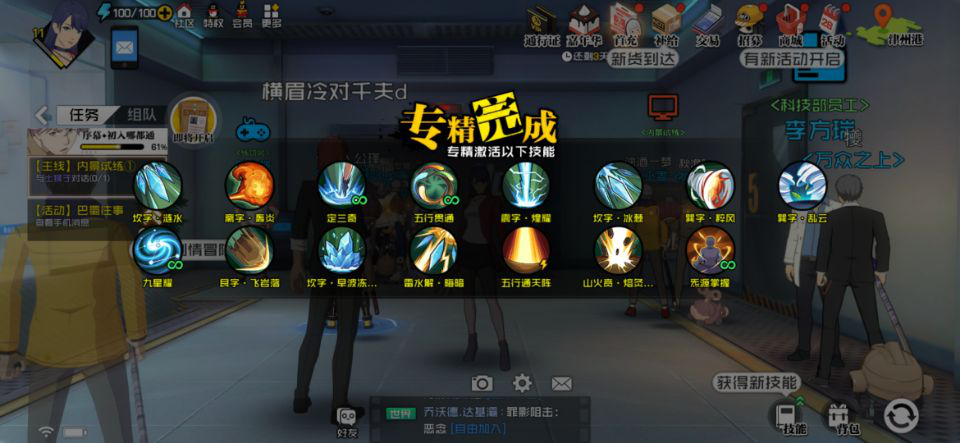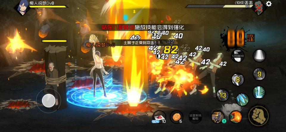 可以看到八卦职业在距离和范围上占据很大的优势,虽然连击与身法是劣势,不过在远处找好定位的话只需要叠伤害就好了,爆发能力强,同时还有意想不到的辅助能力哦,技能也是对应了动漫中的各站位属性,方位字诀攻击。