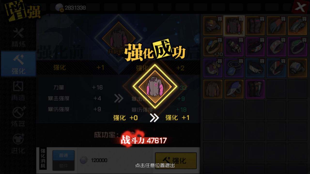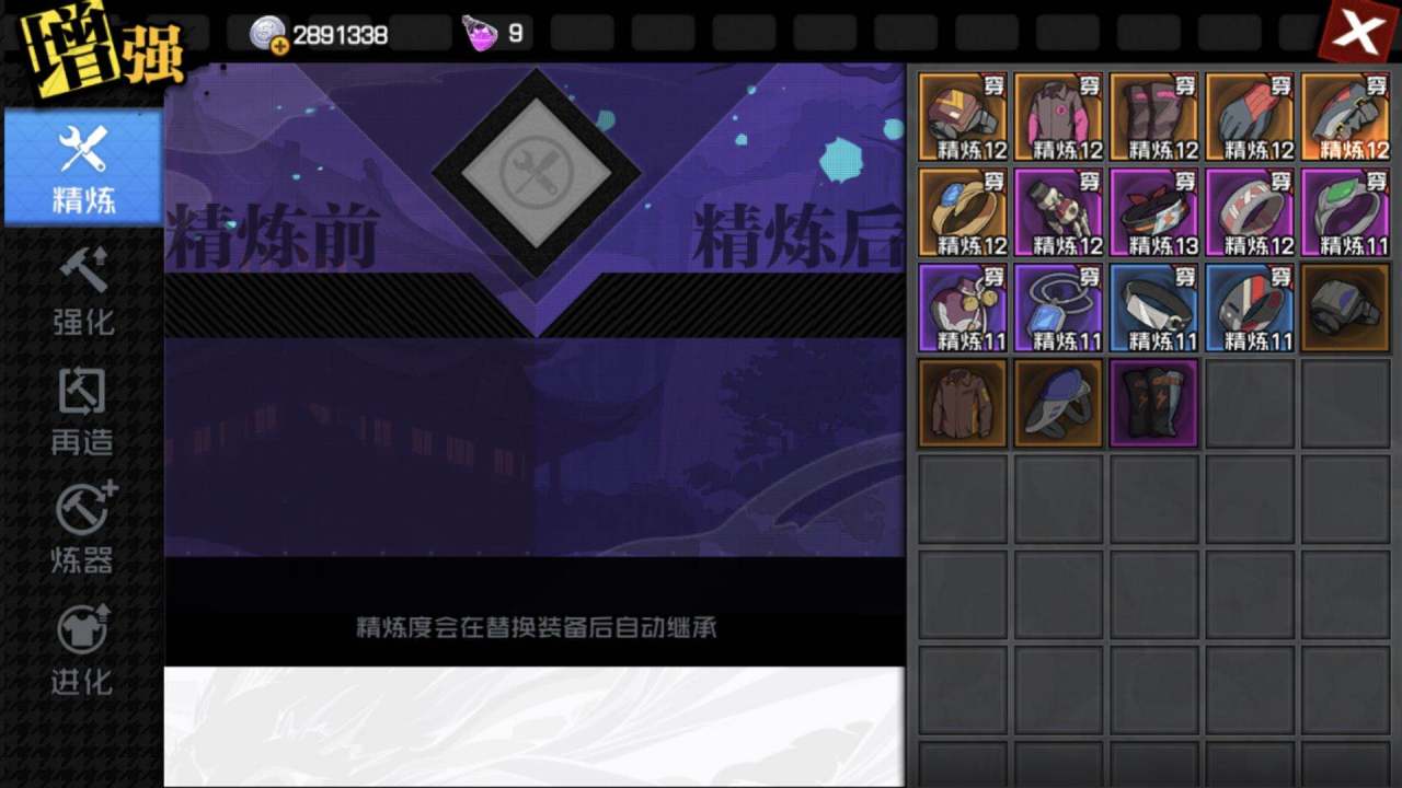 精炼:精炼度完全继承,因此只要有粉尘和银币就可以进行精炼,运气好的可以暴击升2级。游戏中不可专注某个装备的精炼,必须所有装备精炼到相同等级才会解锁下一个等级的精炼。