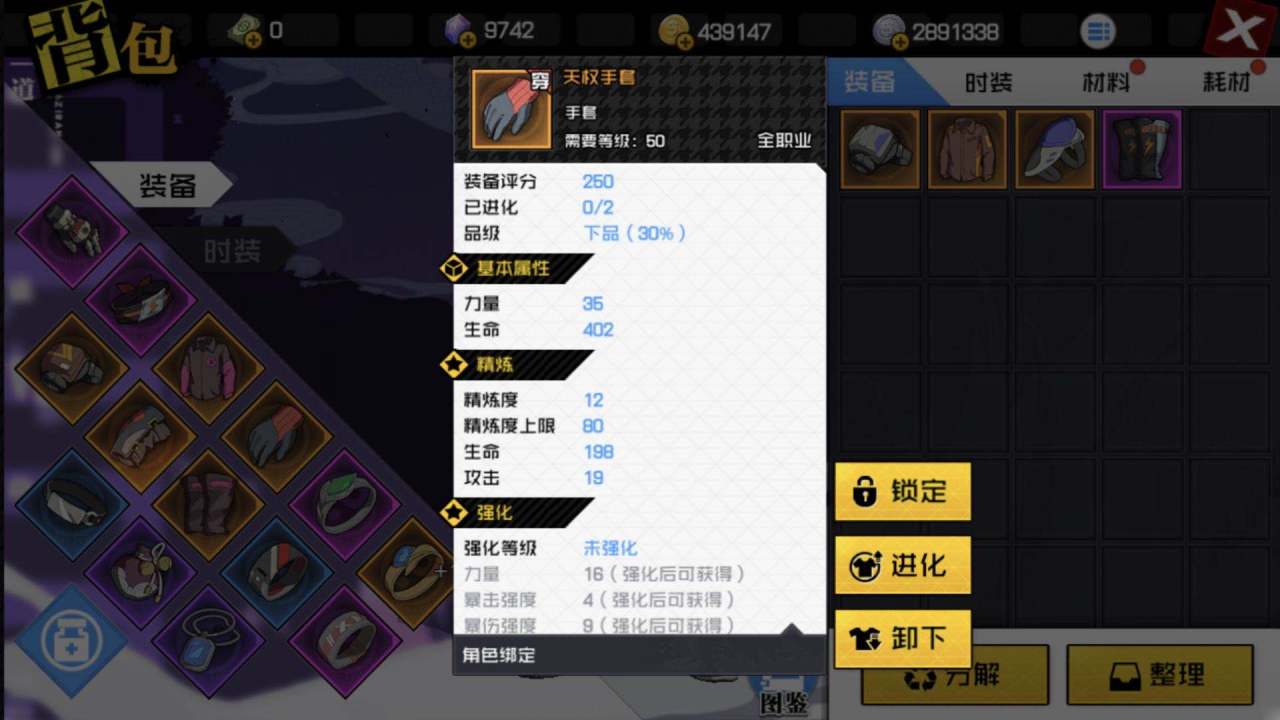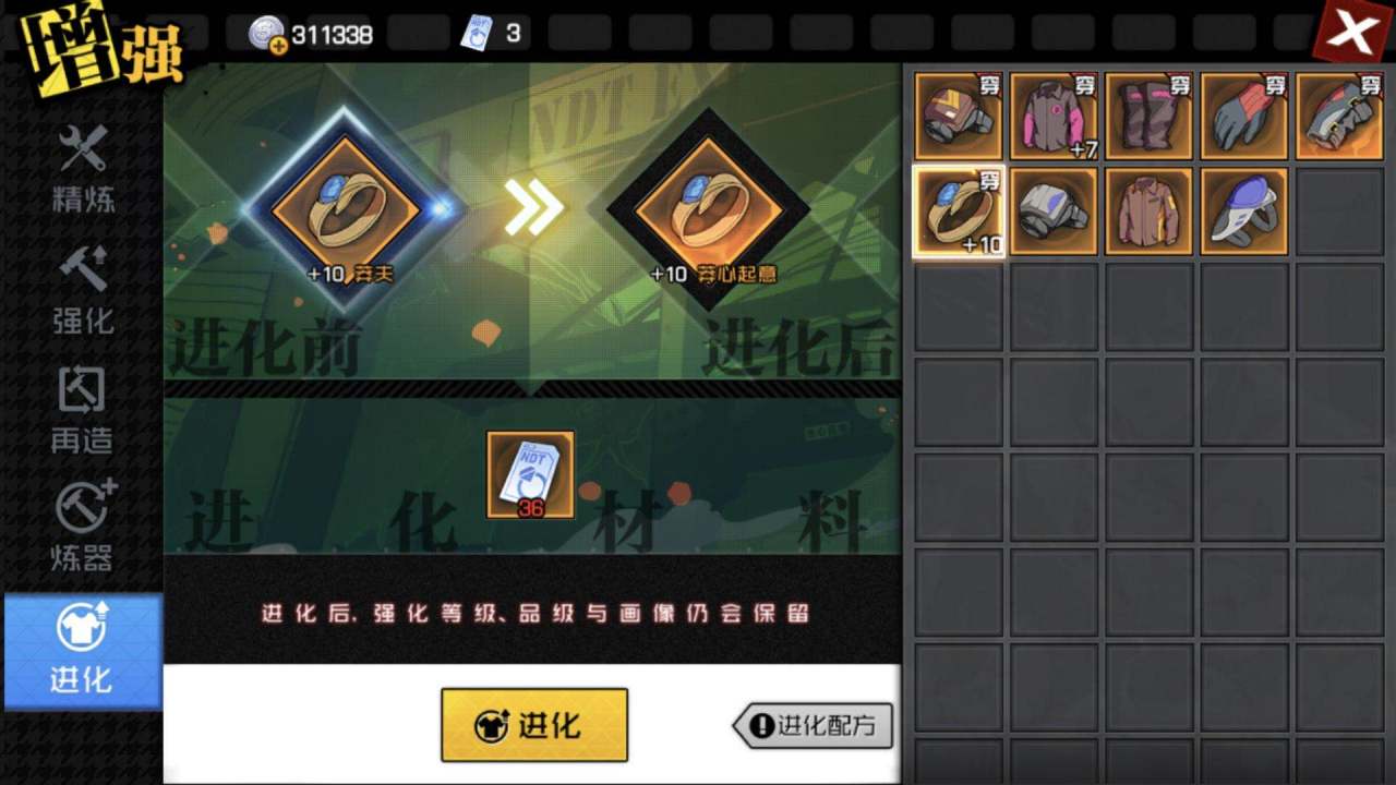 进化:专门给橙色评分250以上的装备用的,使用强化进阶许可可以让装备大幅度提升属性,相当于卡牌游戏中给某个角色升星的感觉,这个功能是可以继承的。