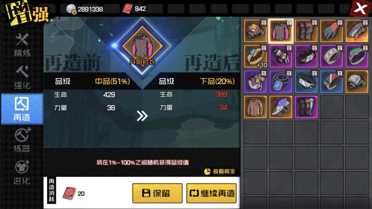 再造:再造出来的装备品级不可继承,因此没有拿到合适的装备绝对不要进行再造,后期手头留个几千一万的再造书,把每个顶级装备的品级都提升到80以上战斗力会远远高于相同等级的玩家。