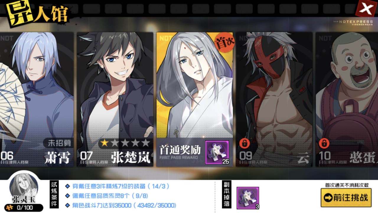 异人集会馆:有三个要求才能进行张灵玉关卡的挑战,第一个是必须有3件精炼7级的装备,这东西只要天天玩一周之内一定可以达到要求。第二个是佩戴任意的炁灵8个,当等级足够的时候会解锁这个功能,因此玩家不用到处问炁灵在哪。