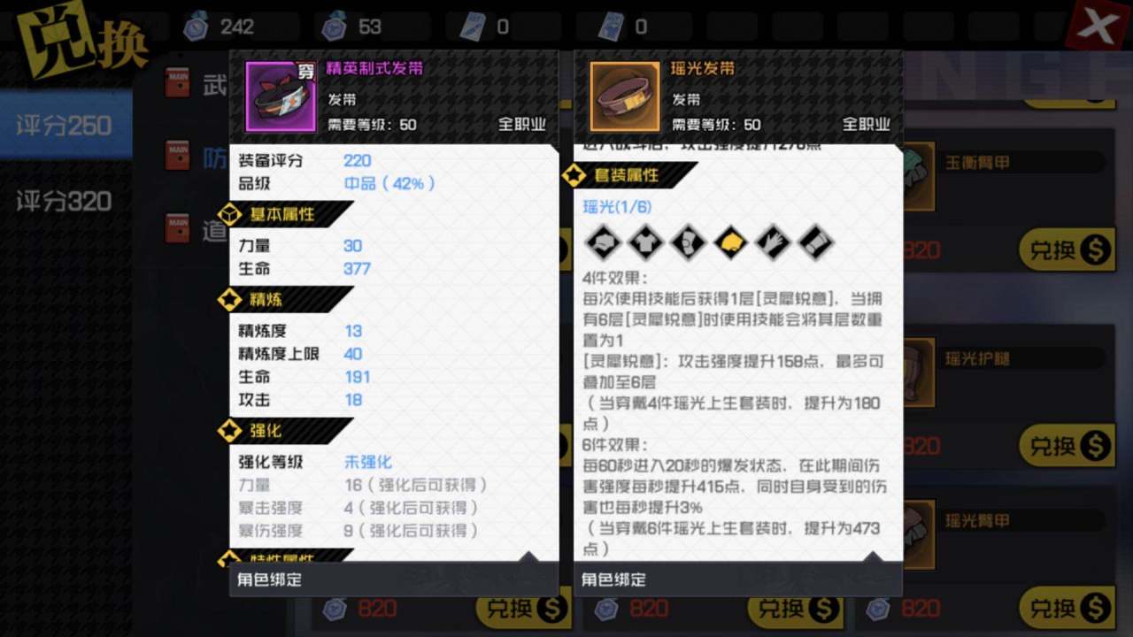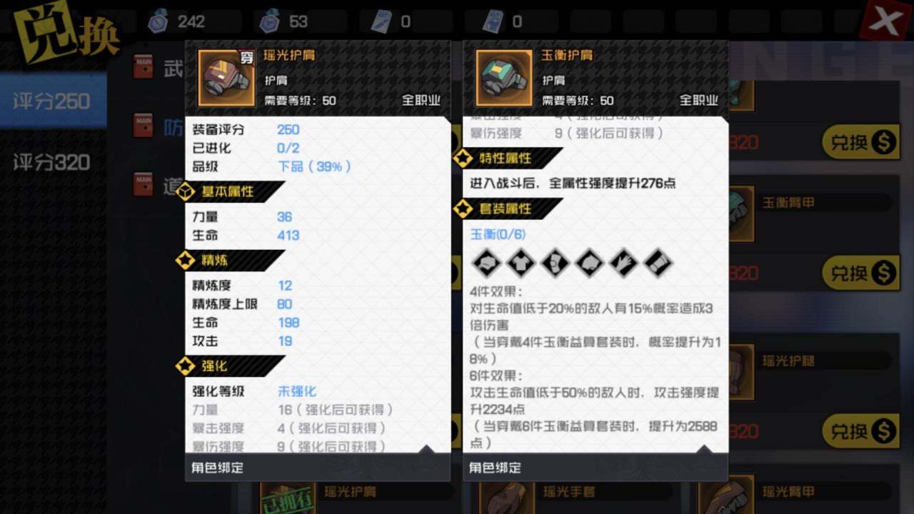 防具有开阳、瑶光、玉衡三种,瑶光的效果是使用技能叠加BUFF,达到6层之后进入伤害加成的状态,当耀光凑够6件每60秒进入赛亚人模式,伤害更高但是有小幅度的额外受伤率。