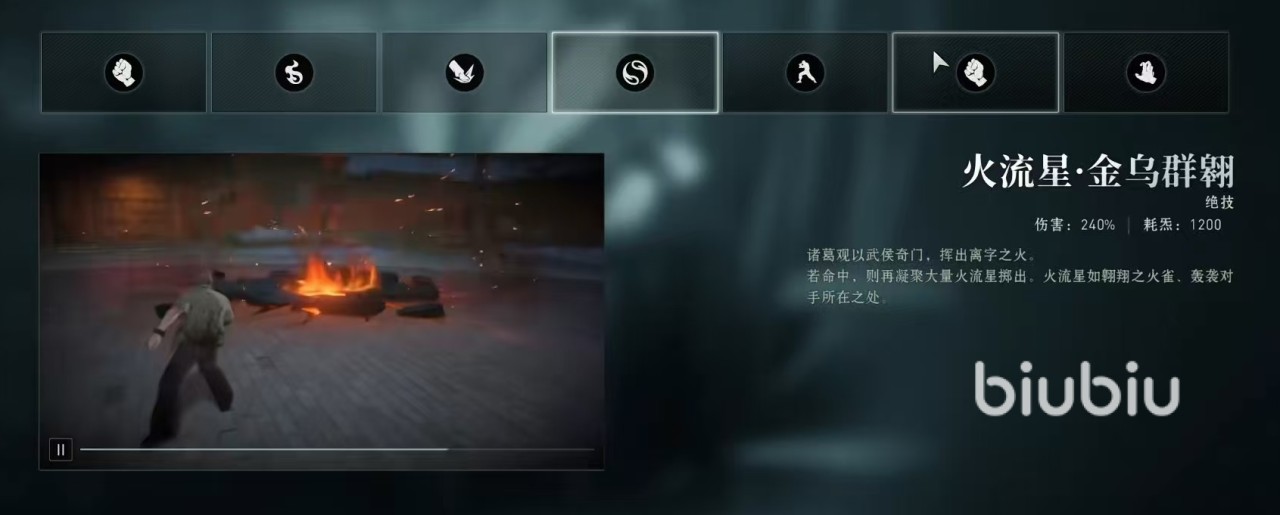 诸葛观的绝技效果也非常炫酷,是火流星金乌群翔,以武侯奇门之术挥动离字之火,命中目标后再凝聚大量火流星投掷出来。火流星就像火孔雀一般对敌方所在之处进行攻击,该技能不仅伤害高,场面上特效更是极为华丽,尤其是命中之后所追加的攻击技能更是有焚山煮海的威势,是游戏中少数几个最震撼的技能效果。