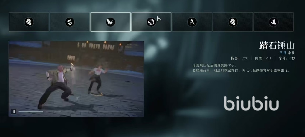 在持续期间内,诸葛观除绝技以外其他所有攻击,都将额外附在火焰伤害。该技能也可以说是比较核心技能,能够在合适时间完成蓄力,并且打出接下来的输出是赢得竞技关键。第二个技能是踏石锤山,诸葛观在跃起之后侧身旋踢对手,如果本次旋踢可以命中目标,那么能追加多次挥打攻击,最后以八级撑锤将对手击飞。虽然伤害并不算高,但是冷却时间8秒,也是非常不错的技能。